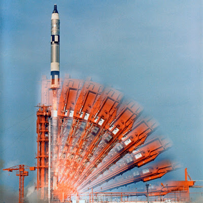 Time exposure image of Gemini X spacecraft, launched July 18, 1966. Astronauts John Young and Mike Collins carried out a three-day mission to rendezvous and dock in space with an Agena spacecraft that had lifted off 101 minutes earlier.