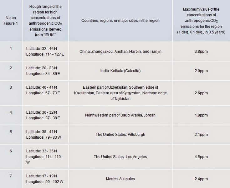 Table 1 A list of regions indicating high concentrations of anthropogenic CO2 emissions derived from "IBUKI" in Figure 1.