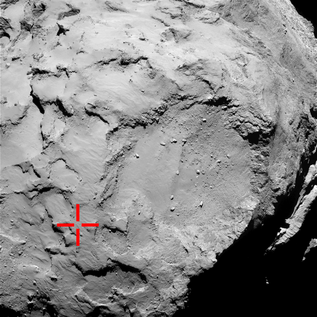 Against the odds – with no downwards thruster and with the automated harpoon system not having worked – Philae bounced twice after its first touchdown on the comet, coming to rest in the shadow of a cliff on Wednesday 12 November at 17:32 GMT (comet time – it takes over 28 minutes for the signal to reach Earth, via Rosetta).