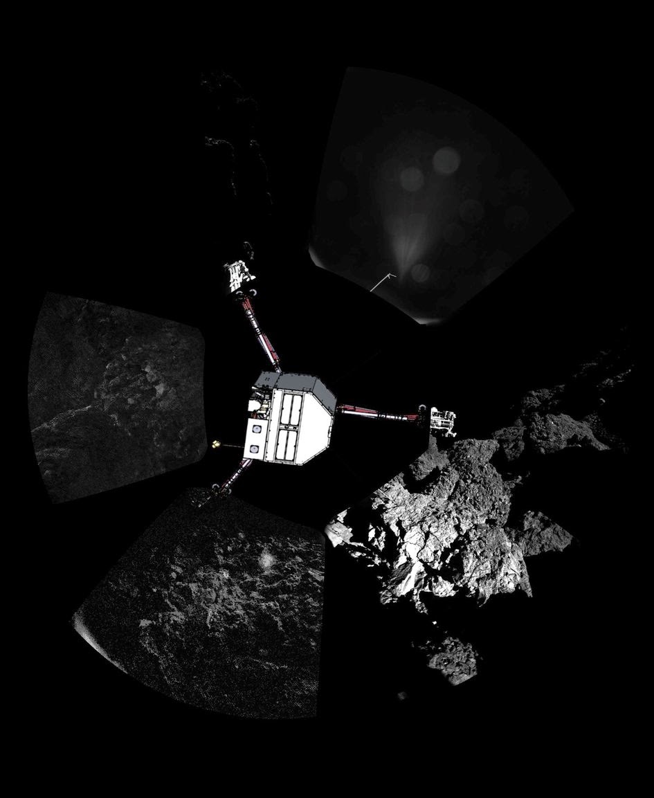 While descent images show that the surface of the comet is covered by dust and debris ranging from millimetre to metre sizes, panoramic images show layered walls of harder-looking material. The science teams are now studying their data to see if they have sampled any of this material with Philae’s drill.