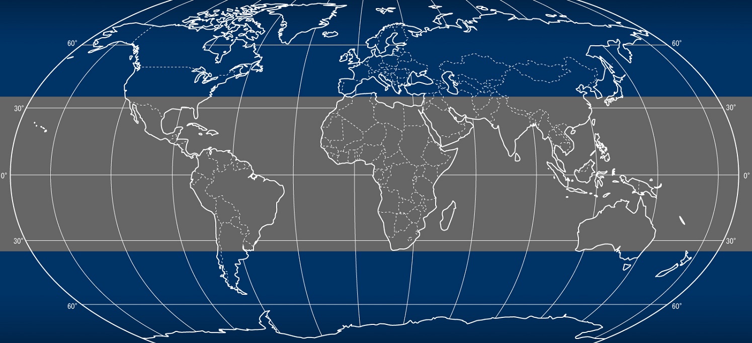 Image above: Because TRMM’s orbit brings it only over the tropics between 35 degrees North latitude and 35 degrees South latitude, Europe, Russia and most of North America and Japan are outside of the potential re-entry area (shown here in gray). Image Credit: NASA.