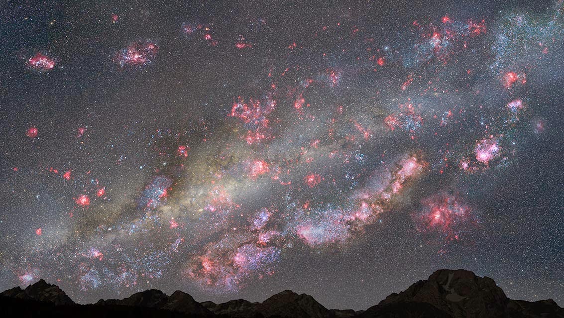 Image above: Artist's view of night sky from a hypothetical planet within a young Milky Way-like galaxy 10 billion years ago, the sky are ablaze with star birth. Pink clouds of gas harbor newborn stars, and bluish-white, young star clusters litter the landscape. Image Credit: NASA/ESA/Z. Levay (STScI).