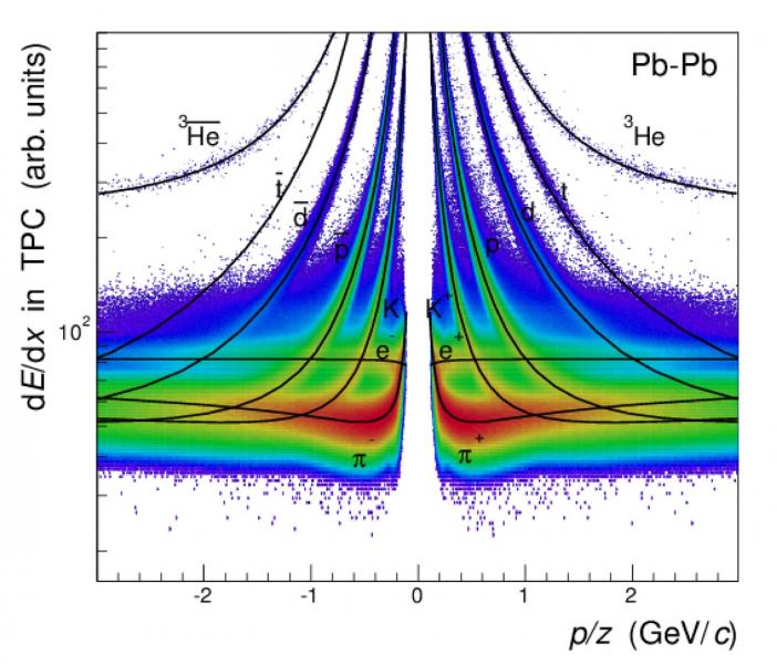 Graphic above: Measurements of energy loss in the time-projection chamber enable the ALICE experiment to identify antinuclei (upper curves on the left) and nuclei (upper curves on the right) produced in the lead-ion collisions at the LHC. (Image: ALICE).