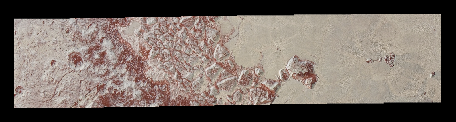 Additionally, a high-resolution swath across Pluto taken by New Horizons’ narrow-angle Long Range Reconnaissance Imager (LORRI) on July 14, and downlinked on Sept. 20, homes in on details of Pluto’s geology. These images -- the highest-resolution yet available of Pluto -- reveal features that resemble dunes, the older shoreline of a shrinking glacial ice lake, and fractured, angular water ice mountains with sheer cliffs. Color details have been added using MVIC’s global map shown above.