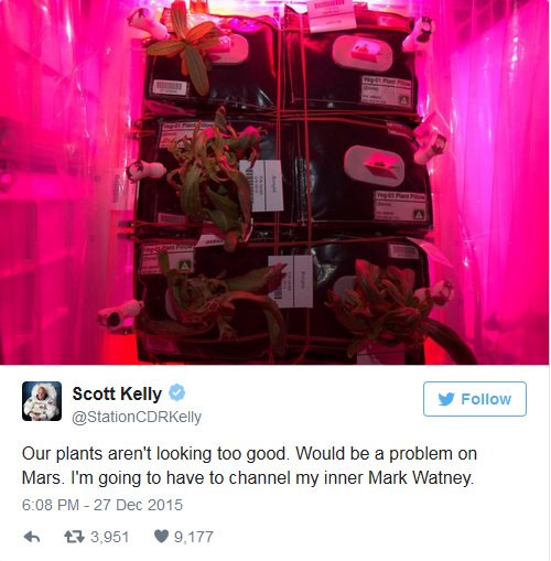 “I think that would be too late,” Kelly told the ground team. “You know, I think if we’re going to Mars, and we were growing stuff, we would be responsible for deciding when the stuff needed water. Kind of like in my backyard, I look at it and say ‘Oh, maybe I should water the grass today.’ I think this is how this should be handled.”