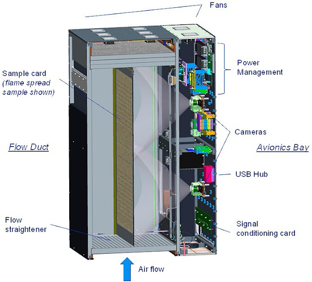 Image above: Saffire Experiment Module (top cover removed for clarity). Hardware consists of a flow duct containing the sample card and an avionics bay. All power, computer, and data acquisition modules are contained in the bay. Dimensions are approximately 53- by 90- by 133-cm. Image Credit: NASA.