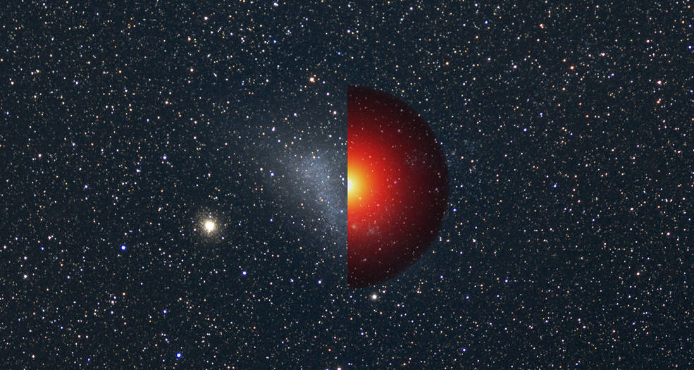 Image above: The Small Magellanic Cloud (SMC), at center, is the second-largest satellite galaxy orbiting our own. This image superimposes a photograph of the SMC with one half of a model of its dark matter (right of center). Lighter colors indicate greater density and show a strong concentration toward the galaxy's center. Ninety-five percent of the dark matter is contained within a circle tracing the outer edge of the model shown. In six years of data, Fermi finds no indication of gamma rays from the SMC's dark matter. Image Credits: Dark matter, R. Caputo et al. 2016; background, Axel Mellinger, Central Michigan University.