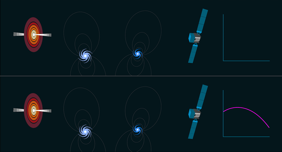 Animation above: Top: Gamma rays (magenta lines) coming from a bright source like NGC 1275 in the Perseus galaxy cluster should form a particular type of spectrum (right). Bottom: Gamma rays convert into hypothetical axion-like particles (green dashes) and back again when they encounter magnetic fields (gray curves). The resulting gamma-ray spectrum ((lower curve at right) would show unusual steps and gaps not seen in Fermi data, which means a range of these particles cannot make up a portion of dark matter. Image Credits: SLAC National Accelerator Laboratory/Chris Smith.