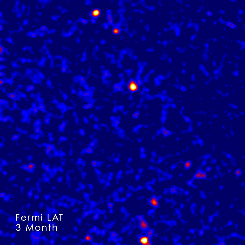 Animation above: This animation switches between two images of the gamma-ray sky as seen by Fermi's Large Area Telescope (LAT), one using the first three months of LAT data, the other showing a cumulative exposure of seven years. The blue color, representing the fewest gamma rays, includes the extragalactic gamma-ray background. Blazars make up most of the bright sources shown (colored red to white). With increasing exposure, Fermi reveals more of them. A new study shows blazars are almost completely responsible for the background glow. Animation Credits: NASA/DOE/Fermi LAT Collaboration.
