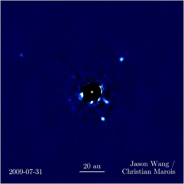 Animation above: This evocative movie of four planets more massive than Jupiter orbiting the young star HR 8799 is a composite of sorts, including images taken over seven years at the W.M. Keck observatory in Hawaii. Animation Credits: Jason Wang/Christian Marois.
