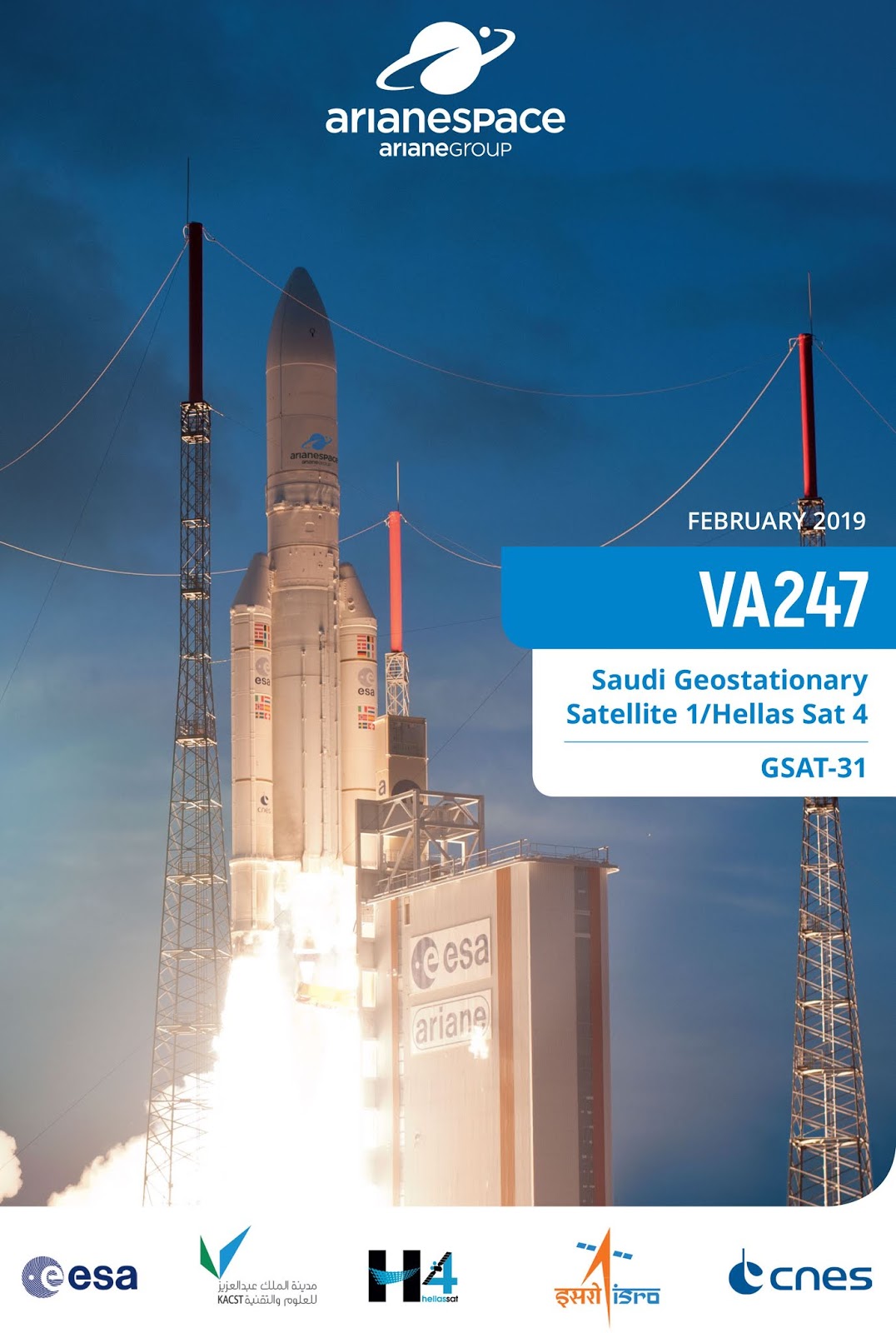 Arianespace has successfully orbited two telecommunications satellites: the Saudi Geostationary Satellite 1/Hellas Sat 4 condosat for operators KACST and Hellas Sat; and GSAT-31 for the Indian Space Research Organisation (ISRO).