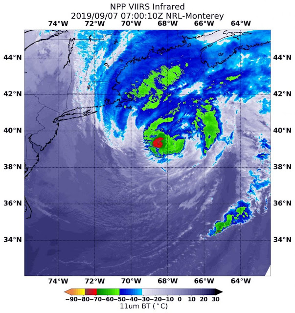 NASA satellites provided forecasters at the National Hurricane Center with infrared data and cloud top temperature information for Hurricane Dorian. Infrared data revealed that Dorian was becoming an extra-tropical cyclone as it moved northeast along the U.S. east coast and the area of strong storms had diminished around the storm.