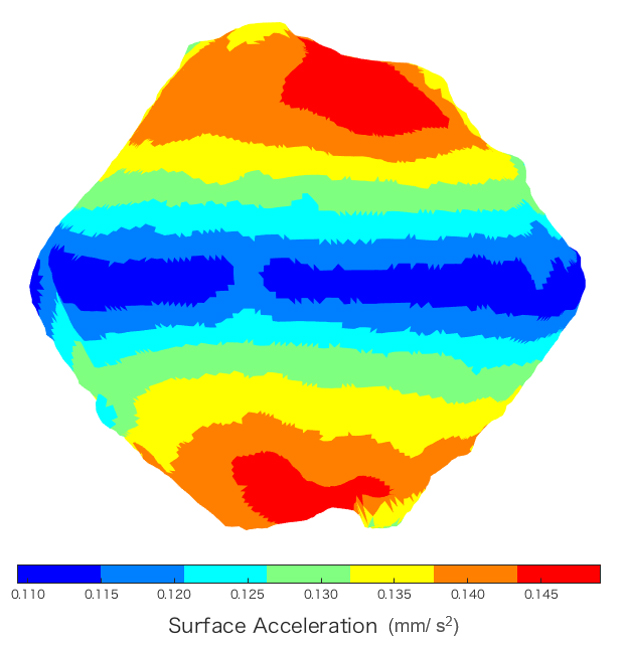 Image above: Figure 3: Distribution of the gravitational acceleration on the surface of asteroid Ryugu. Image credit: JAXA.