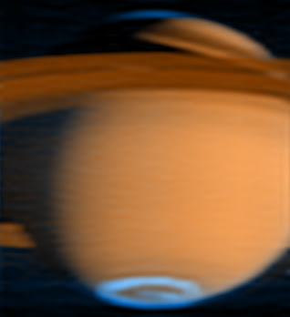 Image above: The aurora at Saturn's southern pole is visible in this false-color image. Blue represents the aurora; red-orange is reflected sunlight. The image was gathered by Cassini's ultraviolet imaging spectrograph (UVIS) on June 21, 2005. Image Credits: NASA/JPL/University of Colorado.