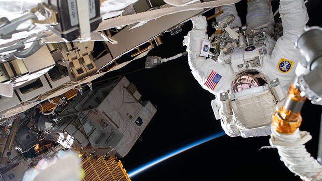 Image above: Astronaut Chris Cassidy works during a spacewalk on July 16 to install lithium-ion batteries on the station. The orbiting lab was flying into an orbital sunrise at the time this photograph was taken. Image Credit: NASA.