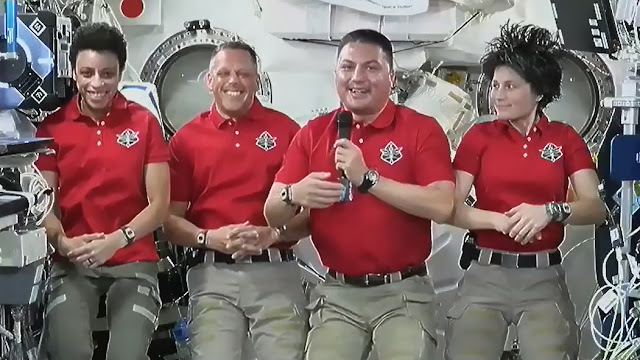 Image above: Astronauts (from left) Jessica Watkins, Bob Hines, Kjell Lindgren, and Samantha Cristoforetti share a light moment during an interview with officials on Earth. Image Credit: NASA.