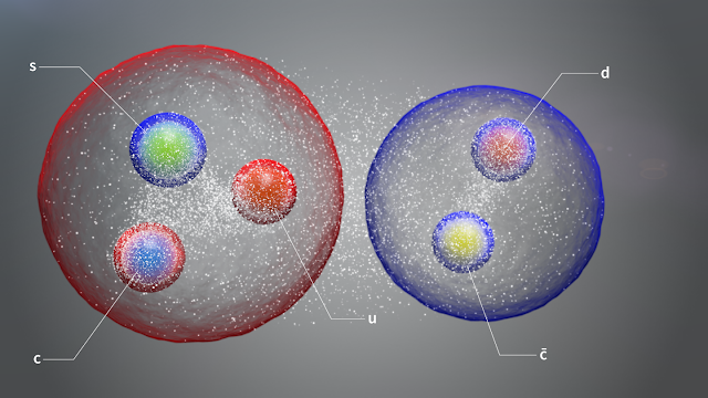 Image above: The new pentaquark, illustrated here as a pair of standard hadrons loosely bound in a molecule-like structure, is made up of a charm quark and a charm antiquark and an up, a down and a strange quark (Image: CERN).